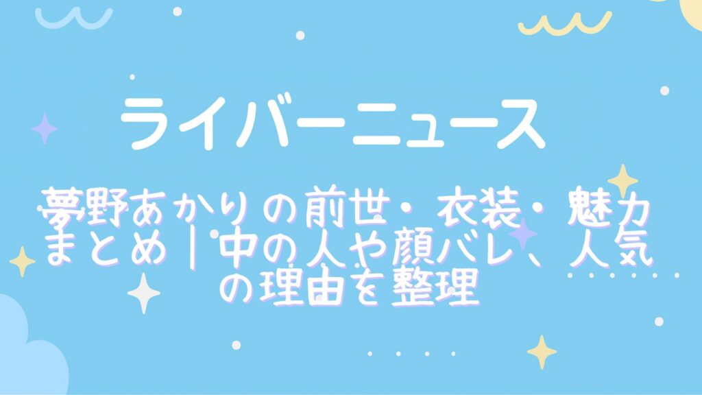 ※このページは、夢野あかりさんの「前世・顔バレ・中の人・事務所・ママ」と「衣装・人気の理由」を短時間で把握するための整理ページです。詳細な根拠・出典は、下の個別記事(前世/衣装)で確認できます。 ぶいすぽっ!所属のVTuber 夢野あかり さん。 ... -